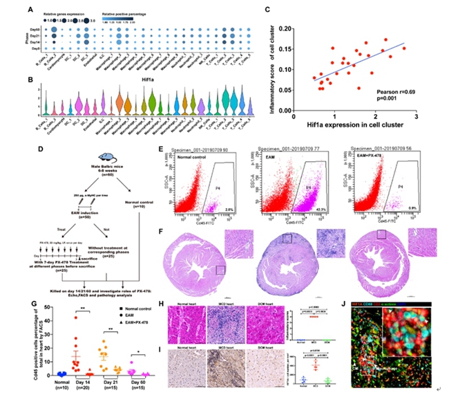 自身免疫性心肌炎是心脏移植的重要病因之一。由于缺乏对自身免疫心肌炎免疫细胞浸润的了解,导致目前缺乏有效的药物治疗。该研究利用单细胞转录组测序技术首次描绘了不同阶段自身免疫性心肌炎小鼠模型心脏免疫微环境特征,并发现与心肌炎炎症阶段相关的细胞类型均高表达转录因子-Hif1α。同时对不同阶段自身免疫心肌炎小鼠给予Hif1α抑制剂(PX-478)进行治疗,发现该靶向抑制剂可以有效地抑制小鼠心脏炎症反应,并且自身免疫心肌炎患者心脏中也高表达Hif1α,该研究为临床治疗心肌炎提供了潜在的治疗策略。