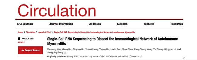 5月20日,雷速比分 胡刚副教授联合中国医学科学院阜外医院宋江平副主任医师团队和宾夕法尼亚大学生物统计系李明瑶教授团队、北京生命科学研究所/清华大学生物医学交叉研究院张昱教授团队交叉合作在《Circulation》杂志上以Original Research Articles形式在线发表题为“Single-Cell RNA Sequencing to Dissect the Immunological Network of Autoimmune Myocarditis”的文章。