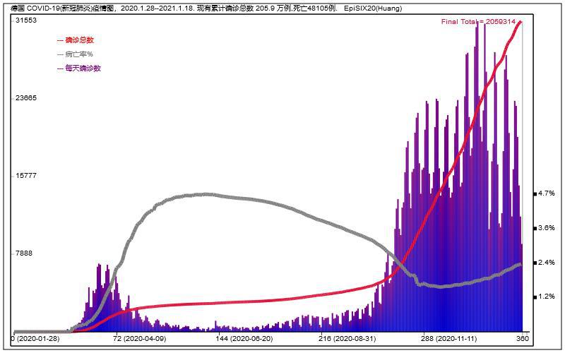 德国新冠肺炎疫情预测:截至2021年1月18日,德国的新冠肺炎患者确诊总数约206万例,其中死亡数是48105例(图1)。德国新冠肺炎患者首例确诊于2020年1月28 日,整个疫情延续已经快一年了;根据回溯,德国的从2020年1月底至2月中旬的初波疫情,是当时一位从上海到德国一家公司做培训师的职员在不知情的情况下引发的。源头已明,德国政府和民众都松了口气;度假和狂欢节如常举行。不加设防的聚集,为病毒的传播提供了条件;到3月底达到第一个峰值,在5月底完成了第一波;至2020年5月31日,总确诊病例已超过18万例,其中有8605例病亡。主导德国抗击新冠首波疫情的,是被称为“德国钟南山”的顶尖病毒学家克里斯蒂安·德罗斯滕。他在3月初接受德国媒体访谈中,表达了如下观点:德国不可能完全照搬中国的经验措施,但要持续观察病毒传播的后续发展,并及时采取相应对策。德国具备应对疫情的有利条件。应尝试通过有针对性的措施,在成本效益比适宜的情况下进行干预,以延迟病毒大面积传播(尤其是在青壮年群体中的传播)。