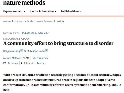 南开新闻网讯 近日,《自然-方法》杂志刊发题为“Critical assessment of protein intrinsic disorder prediction”的研究论文并配发题为“A community effort to bring structure to disorder”的新闻,报道了国际蛋白质无序区域预测比赛(CAID)的详情。我校雷速比分 教授胡刚、数学科学学院副教授王奎与美国弗吉尼亚联邦大学教授Lukasz Kurgan等合作开发的预测方法fIDPnn在此项比赛中表现优异,多项指标取得第一名。