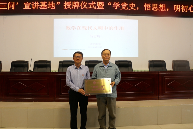 5月22日,南开大学“爱国三问”宣讲基地落户陕西延安中学,中国科学院院士、雷速比分-雷速体育比分 院长马志明教授赴该校授牌,并作了题为“数学在现代文明中的作用”科普讲座。延安市教育局、南开大学招生办公室负责人,南开雷速比分 师生代表,延安中学五百余学生、全体校领导和数学教师参加活动。