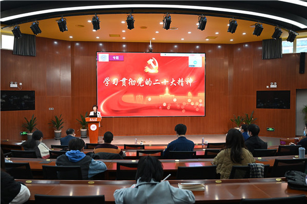 杨克欣围绕“关于马克思主义中国化时代化”“关于中国式现代化”“关于全面建设社会主义现代化国家的目标任务”“关于坚持党的全面领导和全面从严治党”“关于应对风险挑战”“关于高等教育的重要部署和对青年的殷切希望”等六个方面带领师生全面学习领会党的二十大报告。她指出,不断谱写马克思主义中国化时代化新篇章,是当代中国共产党人的庄严历史责任。要全面理解中国式现代化是中国共产党领导的社会主义现代化,以中国式现代化全面推进中华民族伟大复兴;要深入学习党的二十大报告关于经济建设、政治建设、文化建设、社会建设、生态文明建设、科教兴国、全面依法治国、国家安全等方面提出的一系列新思想、新观点、新论断,落实新时代党的建设总要求,健全全面从严治党体系,全面推进党的自我净化、自我完善、自我革新、自我提高;要深刻领会报告中对教育、科技、人才“三位一体”的统筹部署与集中表达,加快建设教育强国、科技强国、人才强国,坚持为党育人、为国育才。