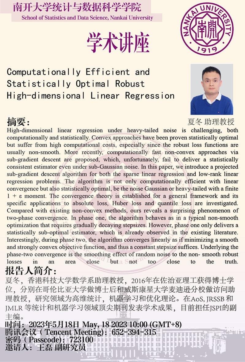Computationally Efficient and Statistically Optimal Robust High-dimensional Linear Regression(夏冬)