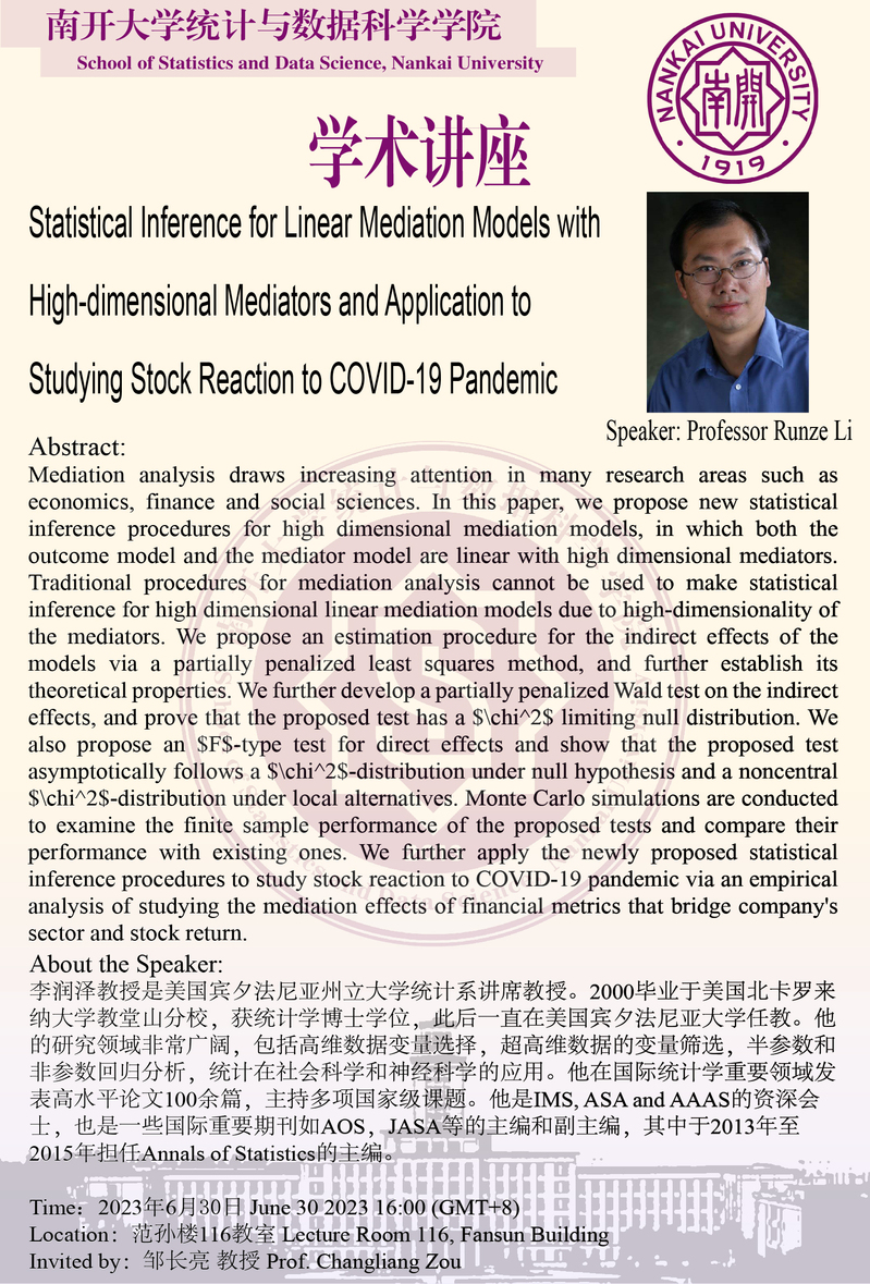 Statistical Inference for Linear Mediation Models with High-dimensional Mediators and Application to Studying Stock Reaction to COVID-19 Pandemic(李润泽)