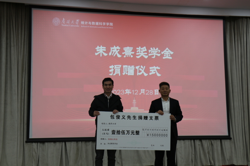 朱成熹奖学金捐赠及颁奖仪式同期举行。包俊义作为朱成熹先生的家属并代郑晓波校友向南开大学教育基金会致送了捐赠支票,陆建军作为代表,为包俊义董事长颁发了捐赠纪念牌。之后,马晶详细介绍了2023年朱成熹奖学金评审情况,包俊义、陆建军、邹玉洁为获奖学生颁发了证书。2020级本科生王震宇代表全体获奖同学发表感言,表达了对捐赠者和学院的感谢,并表示在未来会继续钻研深耕,开拓进取。