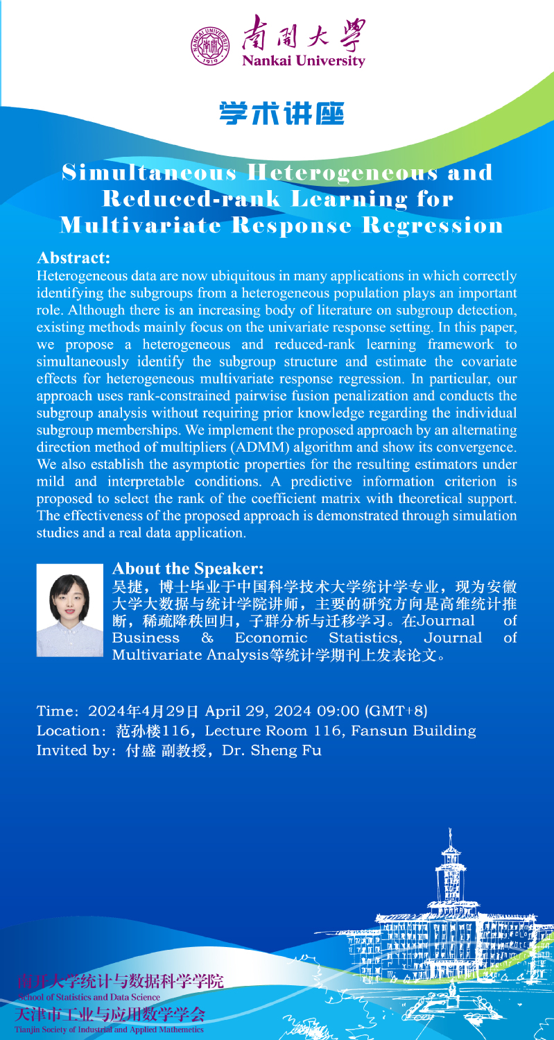 Simultaneous Heterogeneous and Reduced-rank Learning for Multivariate Response Regression(吴捷)