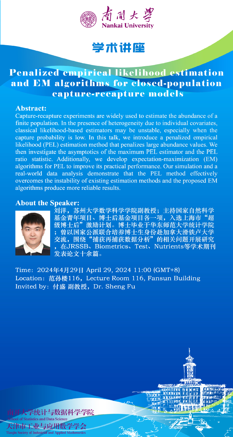 Penalized empirical likelihood estimation and EM algorithms for closed-population capture-recapture models(刘洋)