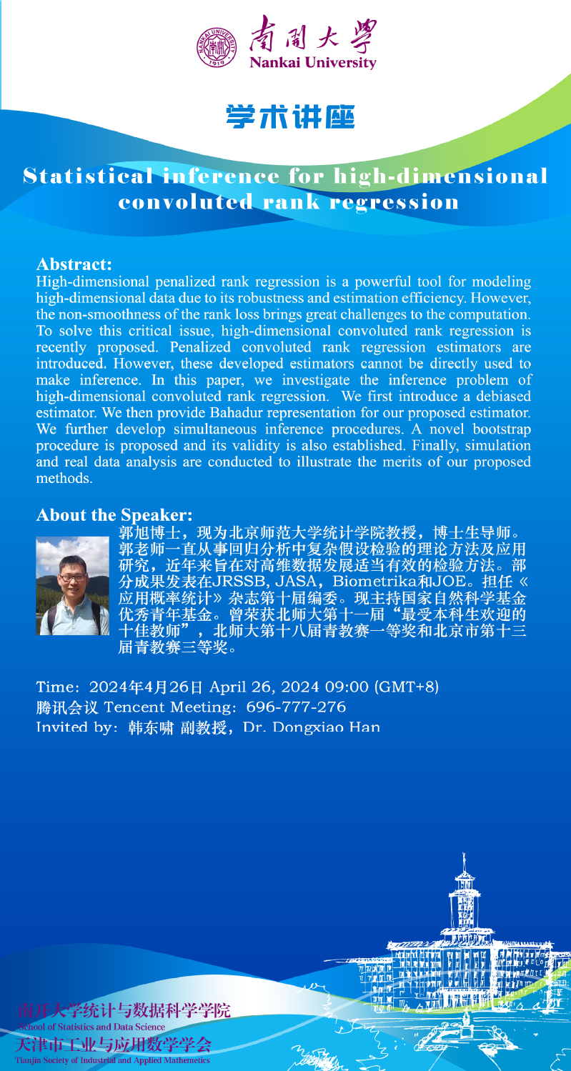 Statistical inference for high-dimensional convoluted rank regression(郭旭)
