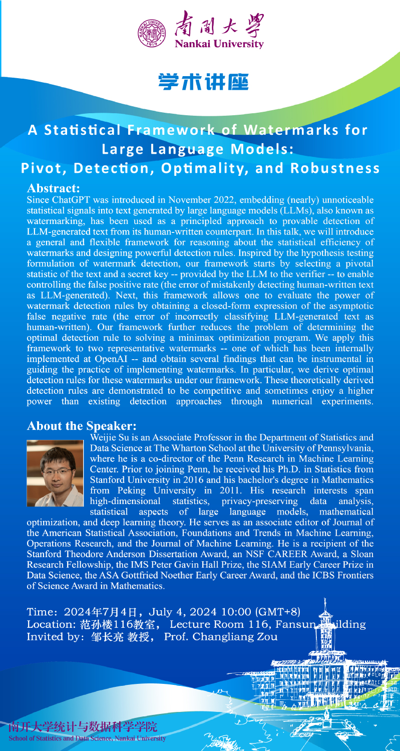 A Statistical Framework of Watermarks for Large Language Models: Pivot, Detection, Optimality, and Robustness(苏炜杰)