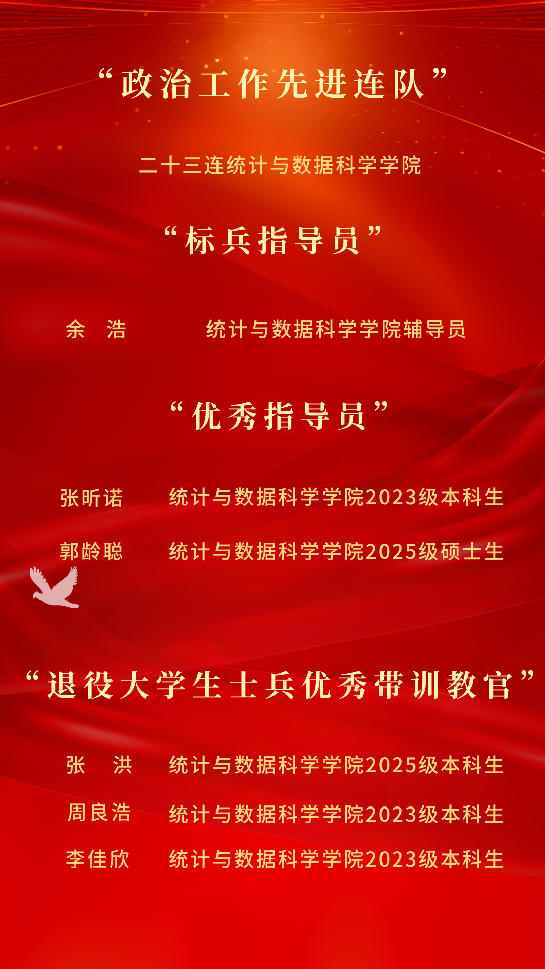 恭贺所有受表彰的集体与个人!新的一年,统计学院师生将珍惜荣誉、再接再厉,以受表彰的先进为标杆,传承发扬军训中锤炼的坚毅品格与纪律作风,坚定不移听党话、跟党走,在求学问道与实践奋斗中践行青春誓言、展现统计风采、贡献青春力量,奋力书写新时代青年挺膺担当、笃行不怠的成长篇章!