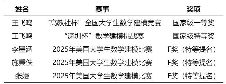 在顶尖赛事中屡创佳绩:1名学生勇夺“高教社杯”全国大学生数学建模竞赛一等奖,展现扎实数理功底;1名学生在“深圳杯”数学建模挑战赛中脱颖而出,斩获全国唯一特等奖——“谭永基特别奖”,系学院第二次在此顶级赛事中摘得桂冠,续写辉煌;3名学生在美国大学生数学建模竞赛中斩获F奖(特等奖提名),在国际舞台上有力彰显南开统计学科实力与学子风采。