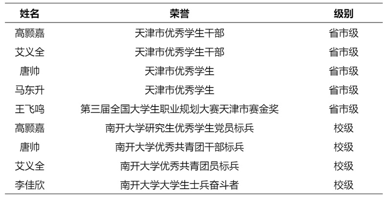 市级荣誉再添新彩:2名学生获评“天津市优秀学生干部”,2名学生获评“天津市优秀学生”,1名学生获第三届全国大学生职业规划大赛天津市赛决赛成长赛道金奖第一名,充分印证学院人才培养的全面性与高质量;校级标兵层出不穷:3名学生分别获评学校优秀学生党员标兵、优秀共青团干部标兵、优秀共青团员标兵,1名学生荣获“大学生士兵奋斗者”称号,形成“一个榜样一面旗,一群先锋带一片”的良好育人氛围,激励全院学子奋勇争先。
